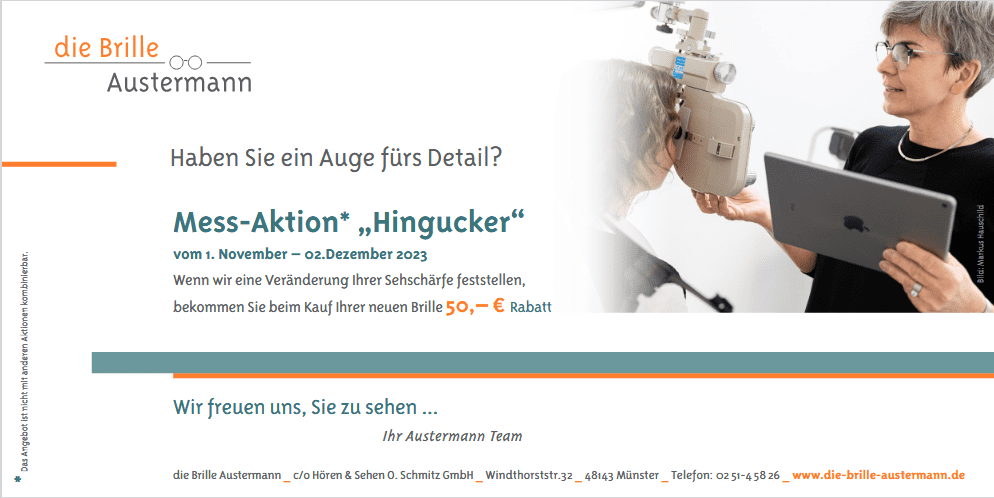 Und damit auch die neue Brille ein schöner Hingucker ist, suchen sie sich doch einfach ihr Lieblingsstück aus unserem Sortiment aus – selbstverständlich ebenfalls zum Hingucker-Preis!